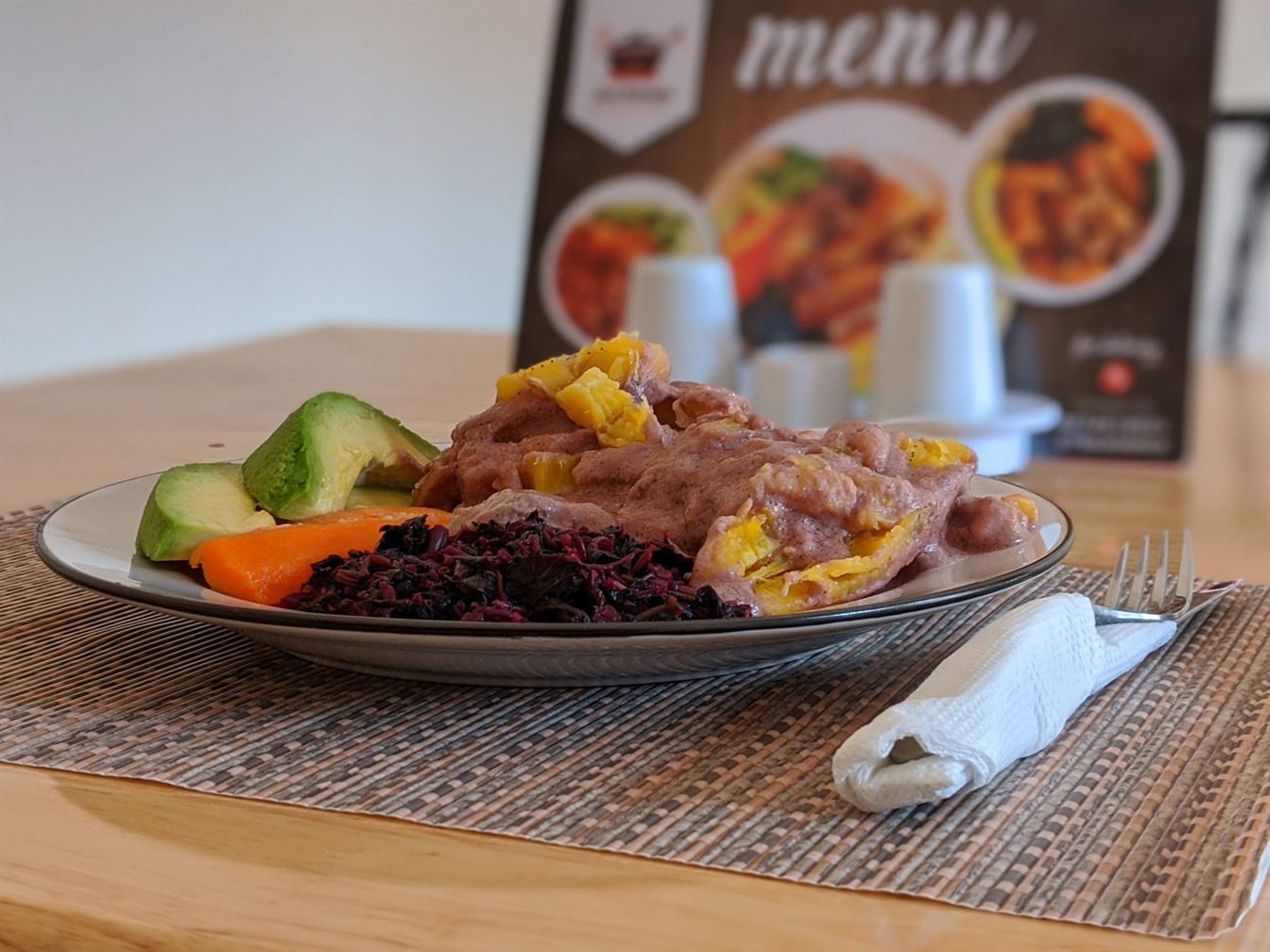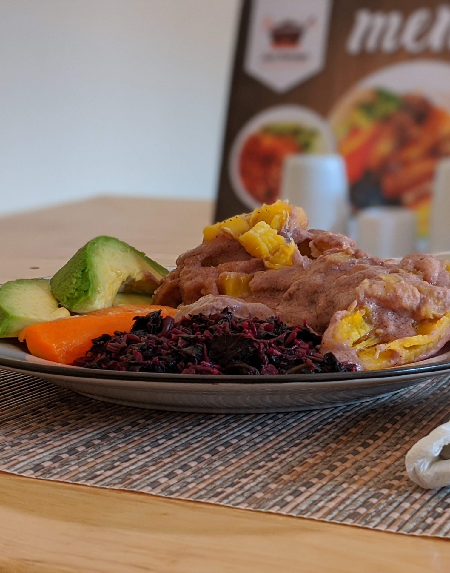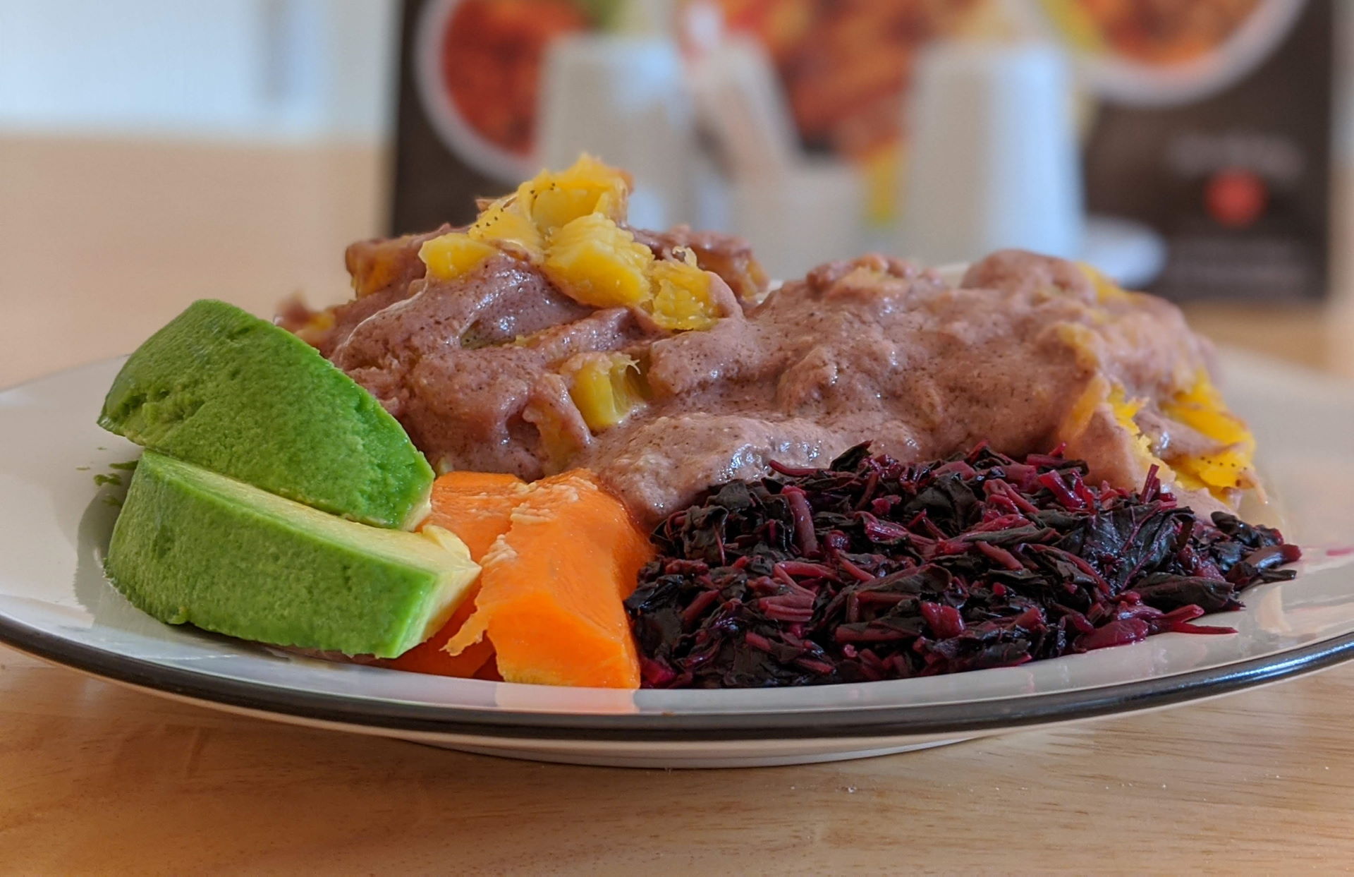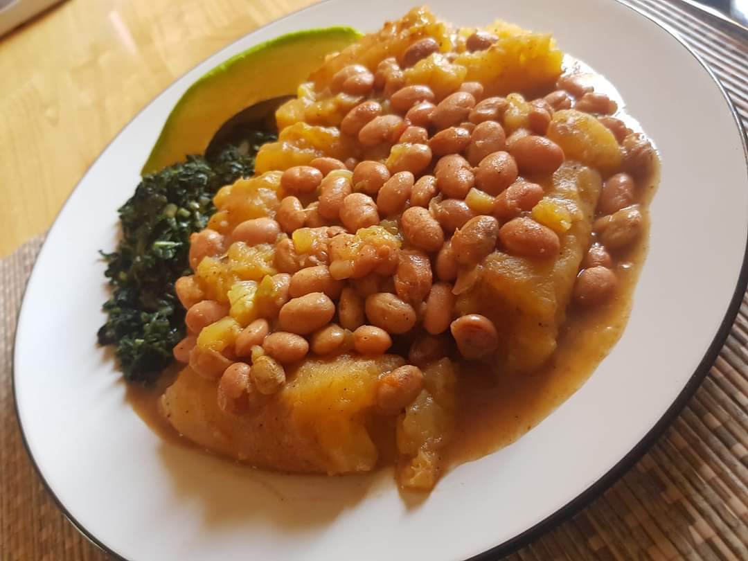 Smaller portion of Matooke or Irish potatoes with Beans or Groundnuts, plus Avocado and Greens for Breakfast